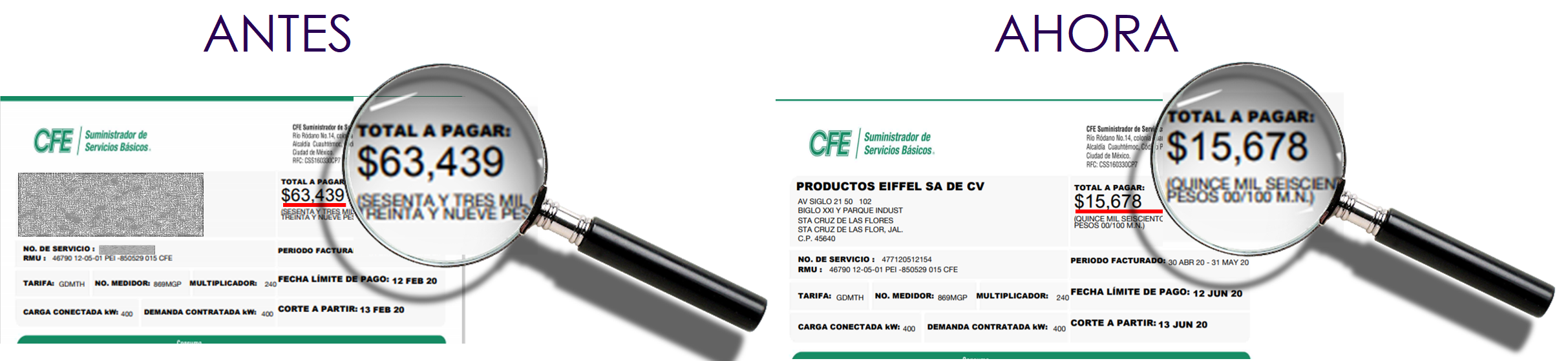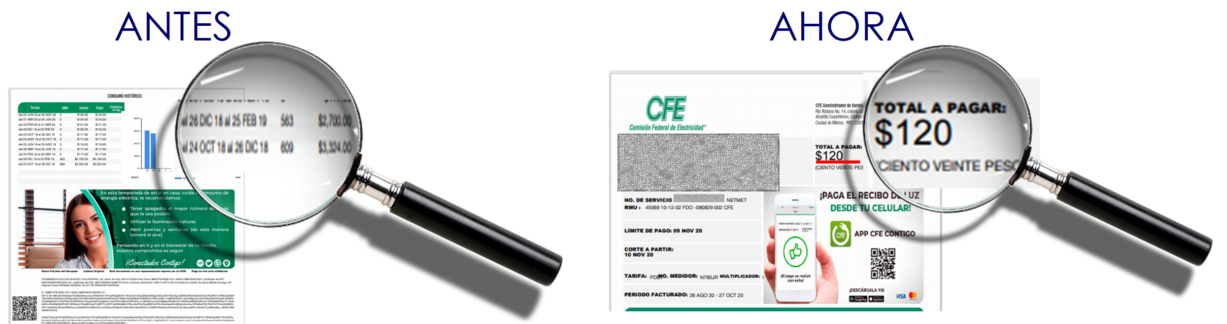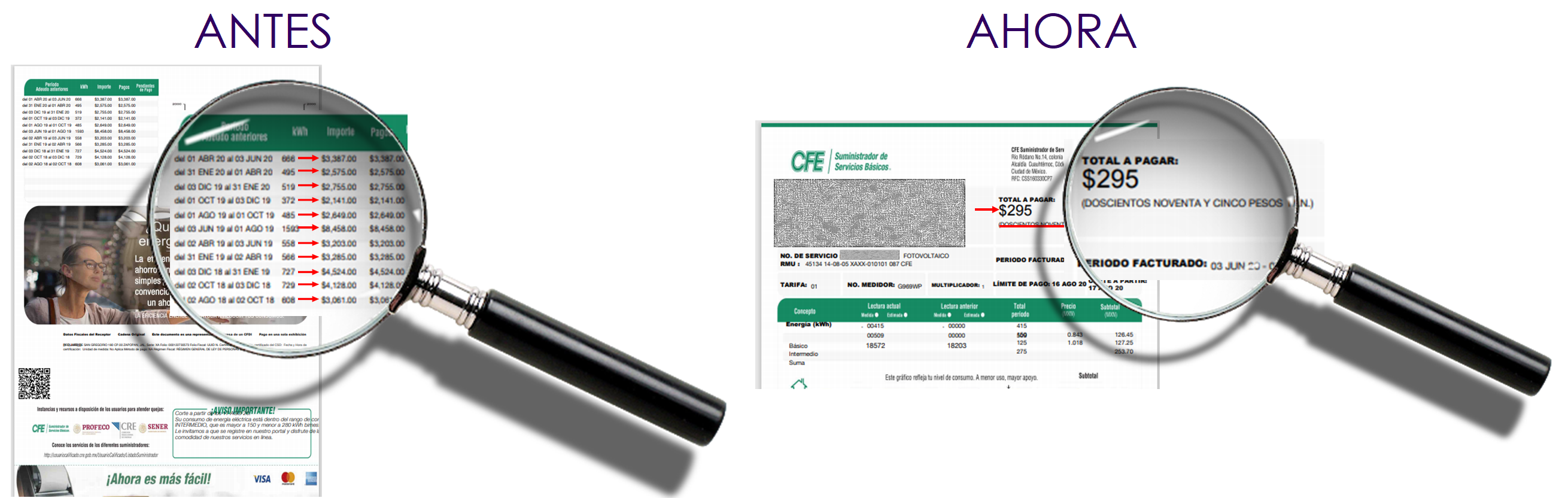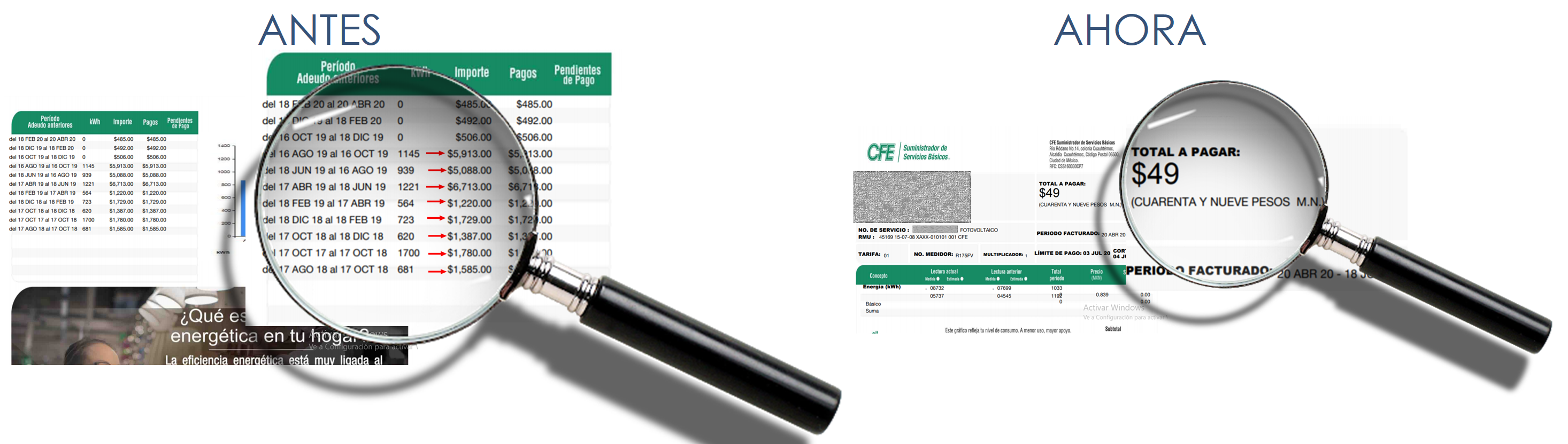 En las imágenes se muestran los costos que pagaban ANTES y la tarifa que pagan ahora, DESPUES de colocar paneles solares, ahorros hasta 90%